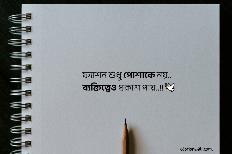 আপনি যা পরেন, তা শুধু পোশাক নয়, এটি আপনার পরিচয়, আপনার মনের ভাষা।” যখন আপনি নিজের স্টাইলের প্রতি দৃঢ় বিশ্বাসী হন, তখন এটি একটি শক্তিশালী স্টাইল স্টেটমেন্ট তৈরি করে। এই ক্যাপশনগুলো আপনার স্টাইলকে আরও প্রখর করে তুলবে।