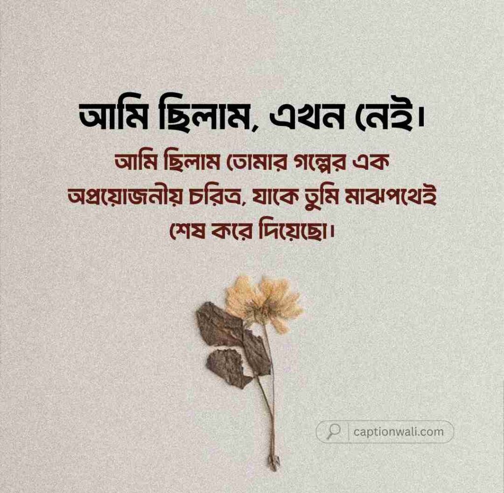 আপনার এই কষ্ট আর শূন্যতাকে একটু হলেও হালকা করার জন্য, আমরা এখানে কিছু কথা, স্ট্যাটাস আর ক্যাপশন নিয়ে এসেছি। এই লেখাগুলো আপনাকে আপনার মনের দুঃখ, হতাশা আর চাপা কষ্টকে সুন্দরভাবে প্রকাশ করতে সাহায্য করবে।