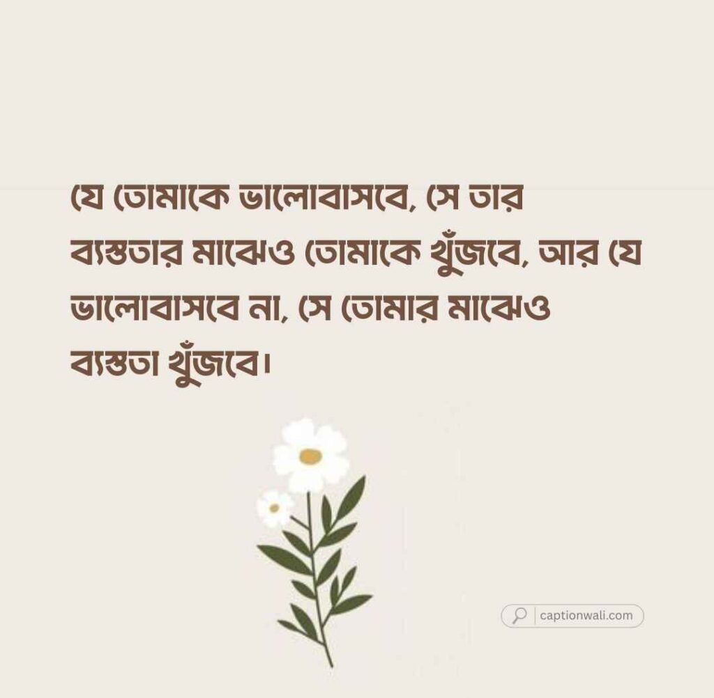 যে তোমাকে ভালোবাসবে, সে তার ব্যস্ততার মাঝেও তোমাকে খুঁজবে, আর যে ভালোবাসবে না, সে তোমার মাঝেও ব্যস্ততা খুঁজবে।