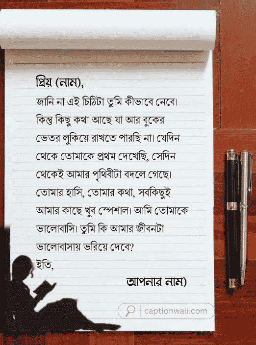 জানি না এই চিঠিটা তুমি কীভাবে নেবে। কিন্তু কিছু কথা আছে যা আর বুকের ভেতর লুকিয়ে রাখতে পারছি না। যেদিন থেকে তোমাকে প্রথম দেখেছি, সেদিন থেকেই আমার পৃথিবীটা বদলে গেছে। তোমার হাসি, তোমার কথা, সবকিছুই আমার কাছে খুব স্পেশাল। আমি তোমাকে ভালোবাসি। তুমি কি আমার জীবনটা ভালোবাসায় ভরিয়ে দেবে?