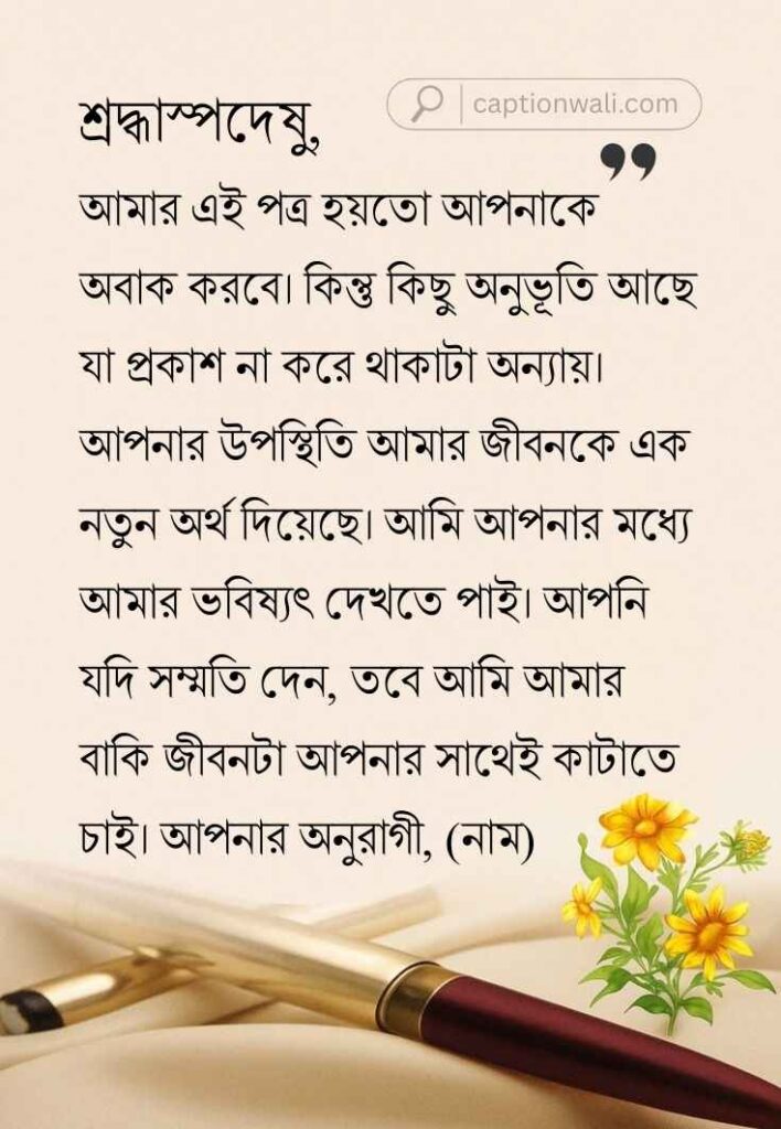 আমার এই পত্র হয়তো আপনাকে অবাক করবে। কিন্তু কিছু অনুভূতি আছে যা প্রকাশ না করে থাকাটা অন্যায়। আপনার উপস্থিতি আমার জীবনকে এক নতুন অর্থ দিয়েছে। আমি আপনার মধ্যে আমার ভবিষ্যৎ দেখতে পাই। আপনি যদি সম্মতি দেন, তবে আমি আমার বাকি জীবনটা আপনার সাথেই কাটাতে চাই। আপনার অনুরাগী, (আপনার নাম)